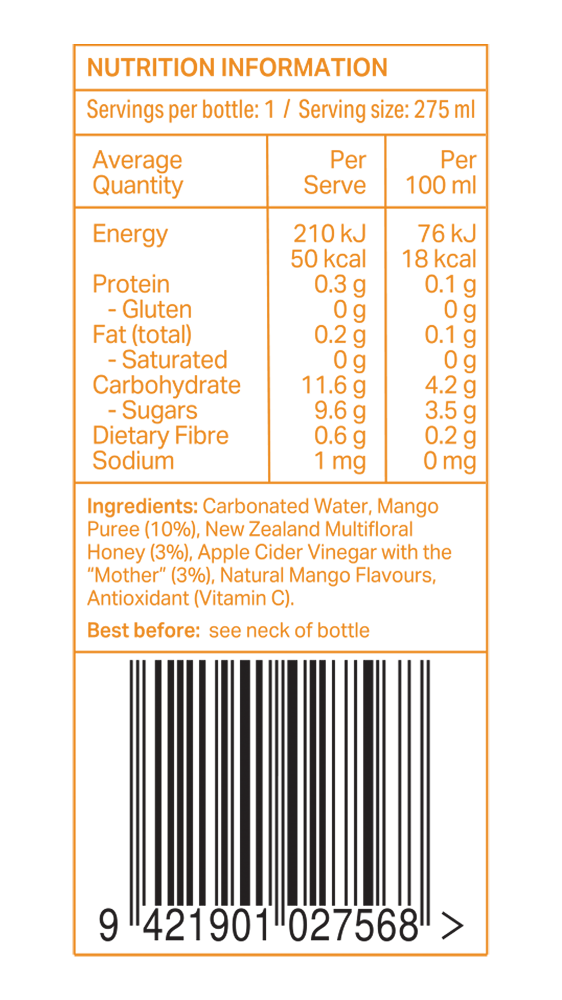 Made with real mango (imperfect fruit included), NZ honey, and organic ACV — nothing artificial, nothing fake, just naturally delicious refreshment.